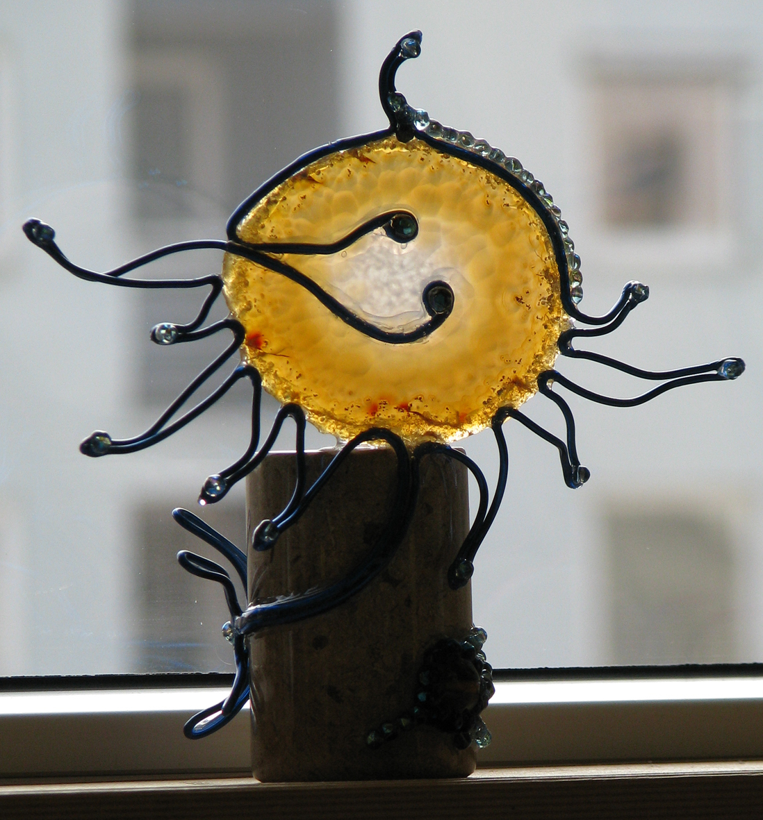 Kiedyś, dawno już, kupiłam spory przezroczysty agatowy plaster, potem drugi, trzeci...Piękne były, ale ich urodę w pełni wydobywało światło, należało je więc wyciągnąć z szuflady, dorysować im drutem jakąś ciekawą formę i wyeksponować w pełnym świetle.